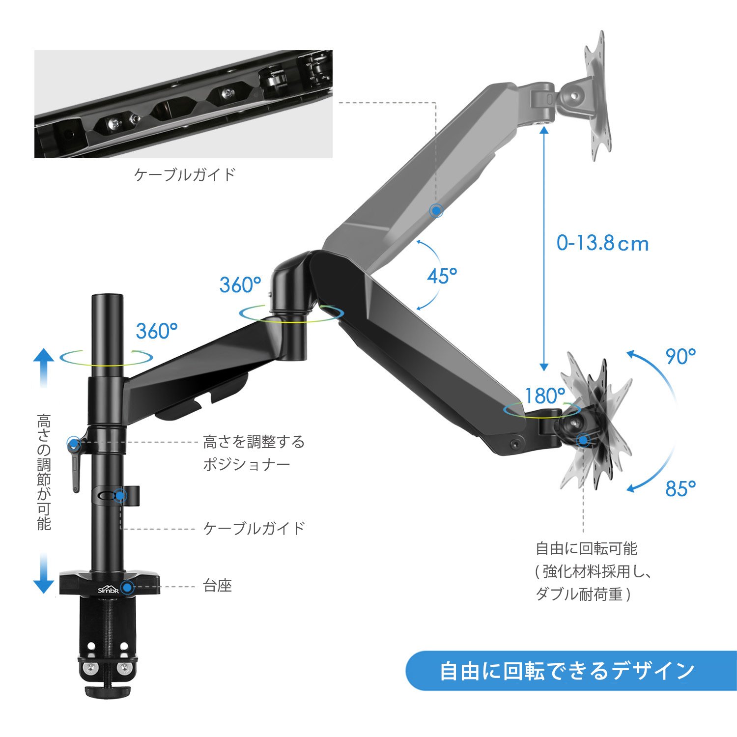 Not only can you adjust the height of about 30 cm on the bottom steel pipe, but because it is a spring type, you can adjust the height without using a tool in the range of 45 degrees up and down of the arm.