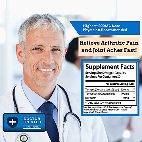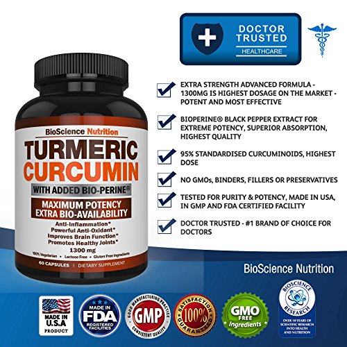 -. Feature : ★ EXTRA STRENGTH ADVANCED FORMULA - 1300MG HIGHEST DOSAGE ON THE MARKET - The most POTENT and MOST EFFECTIVE 1300mg dosage per serving with organic Turmeric Curcumin and BioPerine® (Black Pepper Extract) for enhanced absorption and bio-availability / ★ BIOPERINE® FOR EXTREME POTENCY, SUPERIOR ABSORPTION, HIGHEST QUALITY - We added 10MG of patented BioPerine® (Black Pepper Extract also known as Piperine) that is proven by clinical tests to increase absorption of Turmeric Curcumin by as much as 400% / ★ 95% STANDARDISED CURCUMINOIDS, HIGHEST DOSE - Our Turmeric Curcumin includes 95% standardized Curcuminoids. Curcuminoids will benefit the joints, brain, heart and the circulatory system by helping to neutralize free-radicals, and delay inflammatory precursors by promoting optimal joint health / ★ NO GMOs, BINDERS, FILLERS, PRESERVATIVES - Our Turmeric Curcumin supplement is completely PURE and SAFE. There are no artificial ingredients or stearates in our supplement. It is also FREE OF soy, gluten, milk, egg, shellfish, corn, wheat, and peanuts / ★ TESTED FOR PURITY & POTENCY, MADE IN USA in a FDA and GMP CERTIFIED FACILITY - This product is THIRD PARTY TESTED with strict criteria to assure the highest quality and purity. 100% SATISFACTION GUARANTEED