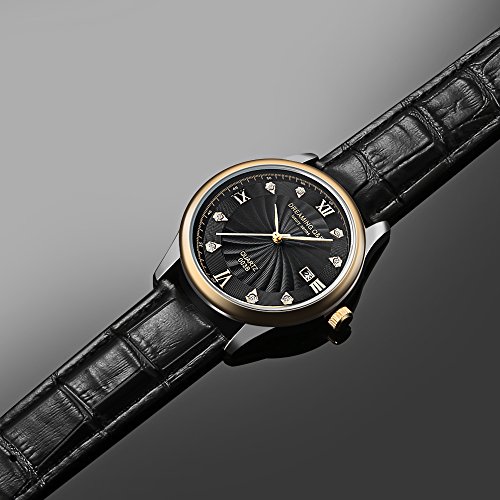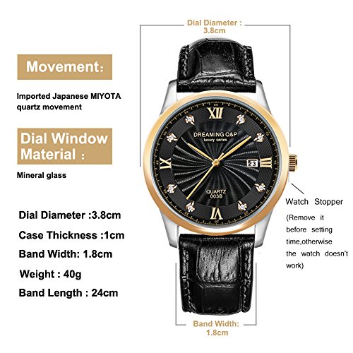 Brand, Seller, or Collection Name:DREAMING Q&P Part Number:MW003LB Model Year:2018 Item Shape:Round Dial window material type:Glass Display Type:Analog Clasp:Buckle Case material:Stainless steel Case diameter:3.80 centimeters Case Thickness:1 centimeters Band Material:Calfskin Band length:Unisex Band width:1.80 centimeters Band Color:Black Dial color:Black Calendar:Date Special features:Date Calendar Item weight:1.44 Ounces Movement:Analog quartz Water resistant depth:30 Meters