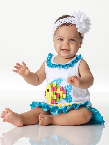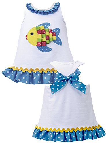 -. Binding : Apparel -. Brand : Bonnie Jean -. Color : Blue -. Department : baby-girls -. Feature : Sleeveless bodice; ribbon fish applique; dotted ribbon trim at round neckline hem / Attached white knit onesie; racerback with grosgrain bow trim / Machine wash. Imported. / Matching/Coordinating sister styles available in sizes 3M-24M, reference style BNJ-24564M. / Note: Headband not included/sold separately -. ProductGroup : Apparel -. ProductTypeName : DRESS -. Title : Baby Girls 3M-24M Turquoise-Blue White Ribbon Fish Applique Knit Romper Dress