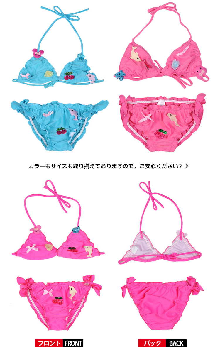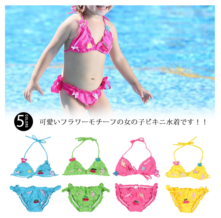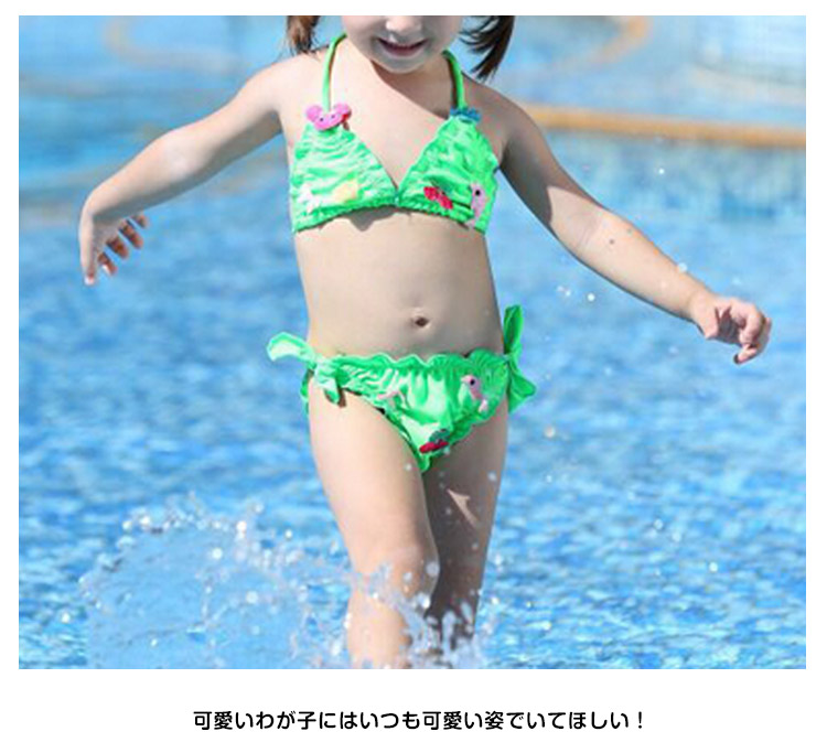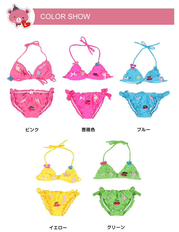 | 可愛いフラワーモチーフの女の子ビキニ水着です!!ビキニー+パンツの2点セットです。可愛いわが子にはいつも可愛い姿でいてほしい!夏の思い出を残すアルバムにも、最高に可愛い姿を残したい!!!可愛い水着をお選び頂けるよう、ご用意致しました☆カラーもサイズも取り揃えておりますので、ご安心くださいネ♪ | |