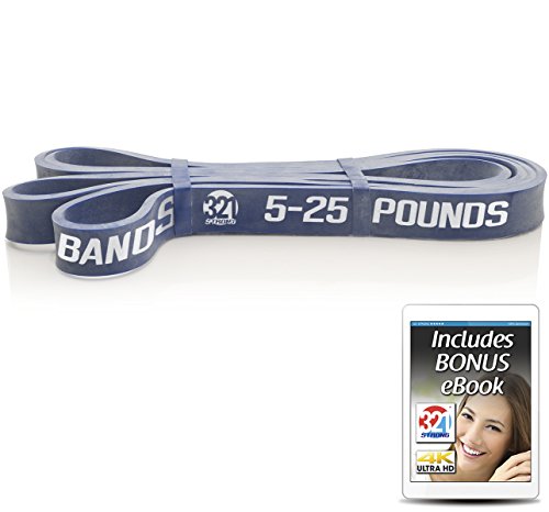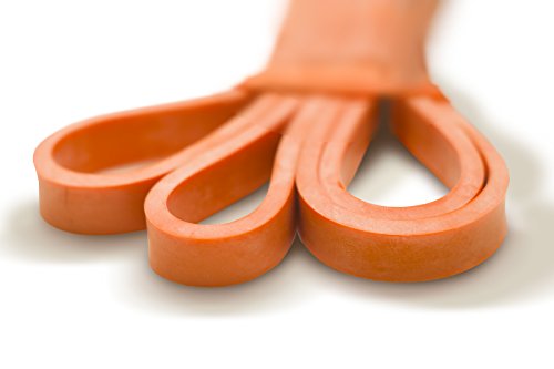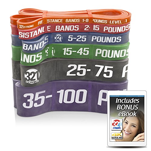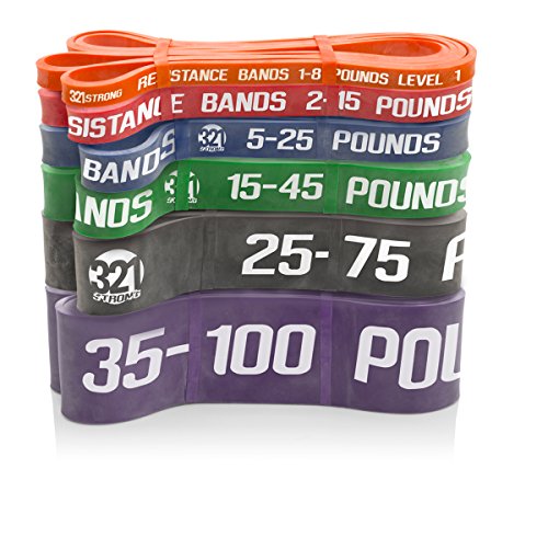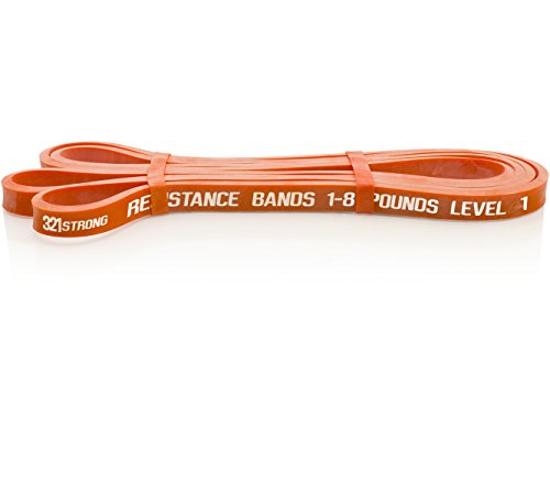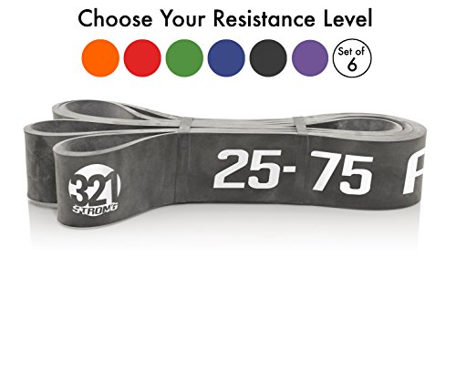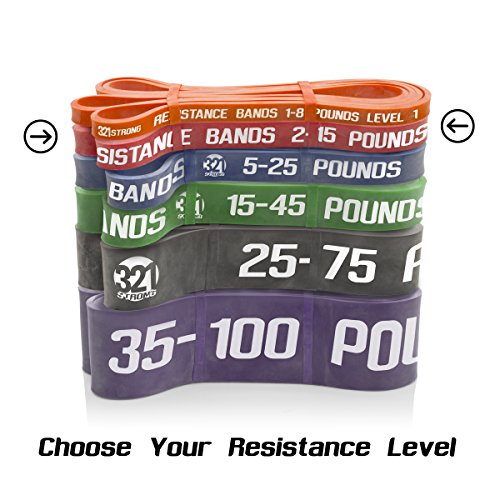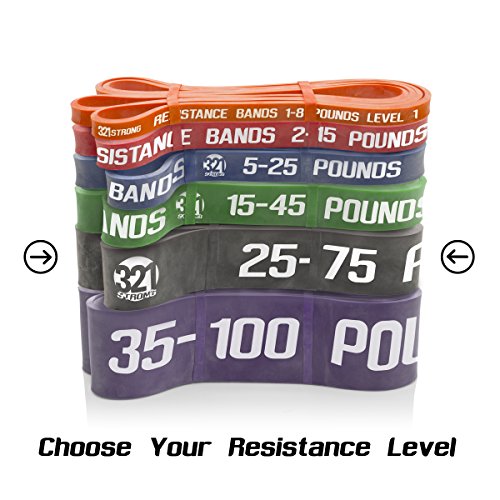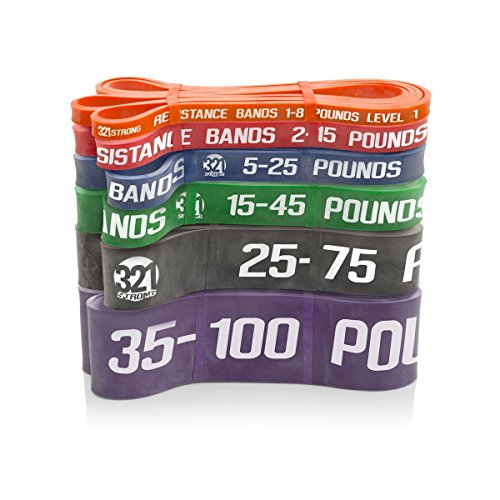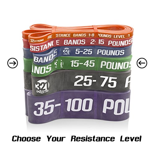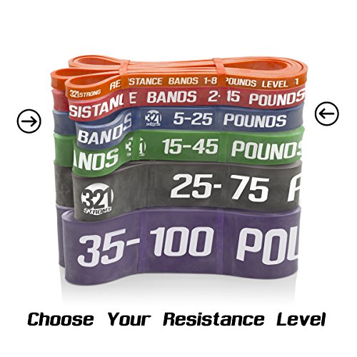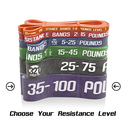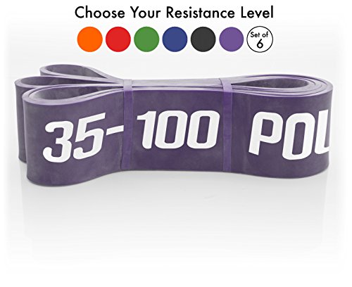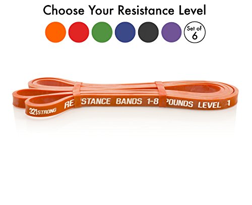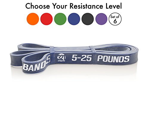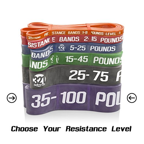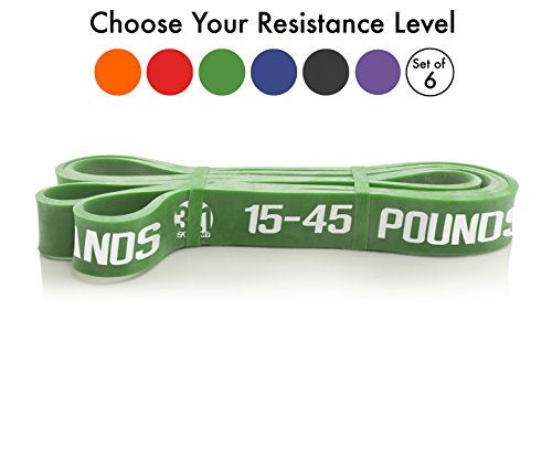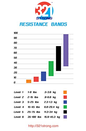 All bands are 4.5MM thick. Here are the different bands and resistances in pounds and kilograms at 25% and 100% stretch: #1 - Level 1 - Orange - 1 - 8 lbs. (.5 - 3.6 kg) - .5 inches (13 mm) #2 - Level 2 - Red - 2 - 15 lbs. (.9 - 6.8 kg) - .75 inches (19 mm) #3 - Level 3 - Blue - 5 - 25 lbs. (2.3 - 11.3 kg) - .87 inches (22 mm) #4 - Level 4 - Green - 15 - 45 lbs. (6.8 - 20.4 kg) - 1.15 inches (29 mm) #5 - Level 5 - Black - 25 - 75 lbs. (11.3 - 34 kg) - 1.75 inches (44 mm) #6 - Level 6 - Purple - 35 - 100 lbs. (15.9 - 45.3 kg) - 2.5 inches (64 mm) Our premium resistance bands each offer assistance for offsetting your body weight, so you can perform more reps, and strengthen and tone muscle. Let the thicker bands get you started, making you feel light for assisted pullups and chinups, just put the band under your right knee or foot. As you get better, the thinner bands assist less, your chin ups and pill-ups are all you. They are also super for heavy lifting, serious squats, powerlifting, bench press, and deadlifts. Each color band has the resistance printed right on them, we are the only company that does that. Great for both men and women, even kids. Beginners and professionals alike will love these bands as they are easy to use, and tough enough for the most demanding workout and strength conditioning. 100% lifetime warranty and satisfaction guarantee. We'll refund your purchase if you don't think this is the most effective resistance band you've ever used. 0 |