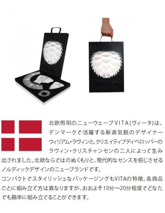 | 自分で組み立てるをコンセプトにした北欧照明のニューウェーブVITA。コンパクトでお洒落なパッケージ、斬新なデザイン、個性的なデンマークのデザイナーズ照明です。ペンダントコードの長さ(最大700mm)の調整は、付属の調整具で行ってください。 |