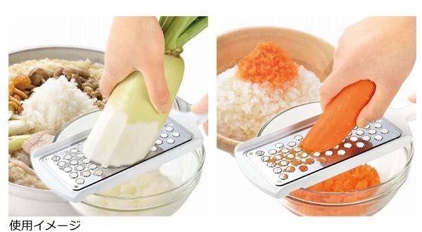 ステンレス製のおろし部で大根やにんじん、山芋などがなめらかにおろせます。