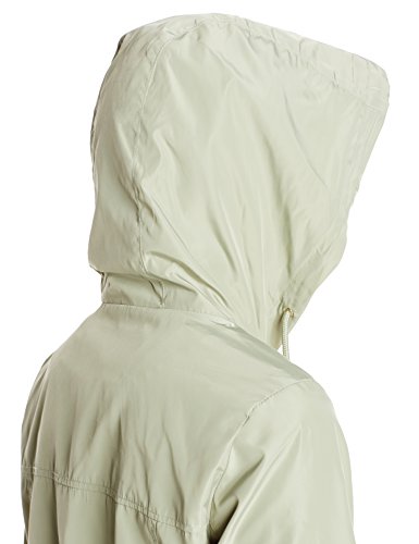 Faux memory packable rain jacket with hood and placket front.