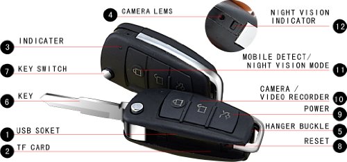 -. Binding : Electronics -. Brand : RundA -. EAN : 0747150173849 -. Feature : High quality image full HD1080P thumb DV, DC / Video format: AVI. Come with motion detection function. / IR leds for night vision / It support recording while charging. / Working time: 100 minutes -. Label : RundA -. Manufacturer : RundA -. MPN : RCK -. PackageQuantity : 1 -. PartNumber : RCK -. ProductGroup : Photography -. ProductTypeName : SURVEILANCE_SYSTEMS -. Publisher : RundA -. Studio : RundA -. Title : 1080P Mini Car Key Nanny Spy Hidden Camera Video Recorder Motion Detection IR Night Vision S820 -. UPC : 747150173849