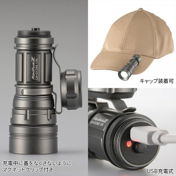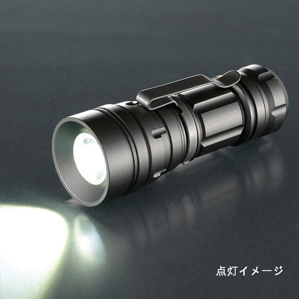 USB充電式のLEDズームライトです。リチウムイオンバッテリーを内蔵しているので、繰り返し充電して使用できます。