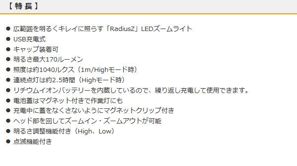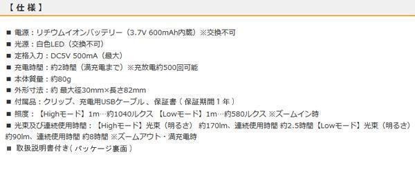 fk094igrjsUSB充電式のLEDズームライトですリチウムイオンバッテリーを内蔵しているので、繰り返し充電して使用できます サイズ 個装サイズ:18×8×4cm 重量 個装重量:120g 製造国 中国 広範囲を明るくキレイに照らすLEDズームライト USB充電式のLEDズームライトですリチウムイオンバッテリーを内蔵しているので、繰り返し充電して使用できます