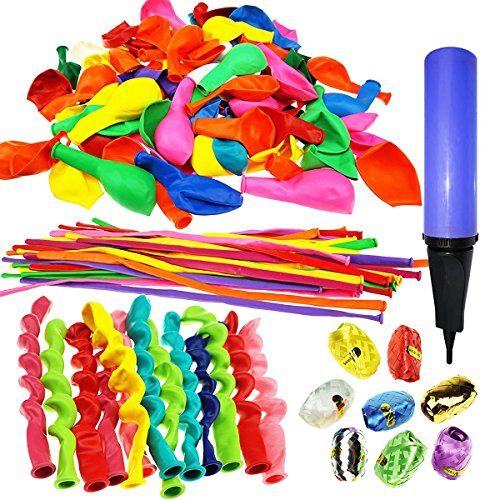 1. VALUED PACK:Each pack contains about 100 pearlized balloons,100 long balloons, 40 twisted balloons in assorted colors,also Included a Hand Held Balloon Air Pump Inflator. This set has all the items you need for the party!