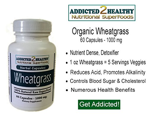 Studio : Addicted 2 Healthy Nutritional SuperFoods Publisher : Addicted 2 Healthy Nutritional SuperFoods Binding : Health and Beauty Product Description Wheatgrass Capsules are made with high quality, 100% pure organic wheatgrass powder. Each bottle contains sixty (60) vegetarian capsules. Recommend dosage is 1 - 2 capsules once or twice daily. We manufacture and package our own capsules and guarantee the purity of all ingredients. This sets us apart from many health food resellers on Amazon. Health benefits of wheatgrass: One of the most alkaline foods on the planet. Blood builder, detoxifies, lowers blood sugar, cholesterol, and blood pressure. 2 oz wheatgrass juice = 5 servings of veggies in nutrient value. Energizer. 0