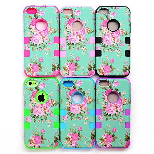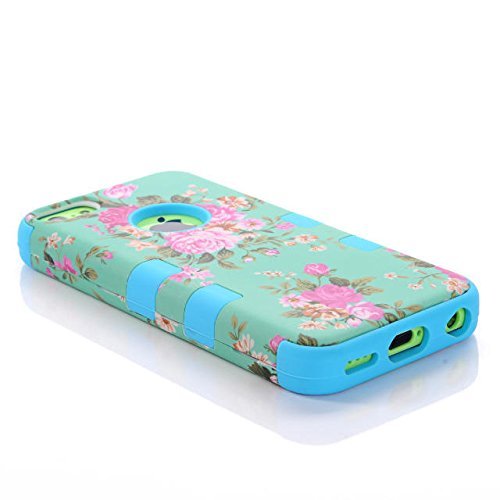 iPhone 5c case,UULIKE[3in1 Shield Series] Hard PC&Soft Silicone Combo Hybrid Defender High Impact Body Armorbox Case for Apple Iphone 5c (Pink Flower Mint Back&Blue)