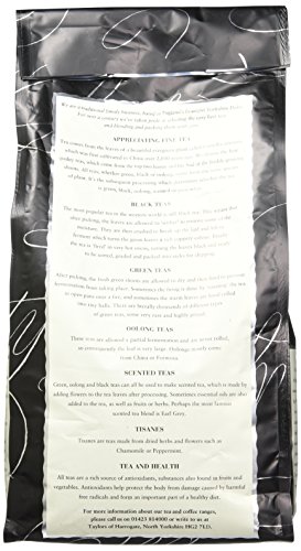-. Binding : Grocery -. Brand : Taylors of Harrogate -. EAN : 0603256060257 -. Feature : One 1-kilogram bag of loose tea (35.3 total ounces) / Made with 100% natural Indian and African teas / High in antioxidants; loose tea lets you brew the perfect cup / Rich, full-bodied flavor best served with milk; tea comes bagged to help preserve freshness / Indian and African teas blended and packed in England -. Label : Taylors of Harrogate -. Manufacturer : Taylors of Harrogate -. Model : 1535 -. NumberOfItems : 1 -. PackageQuantity : 1 -. ProductGroup : Grocery -. ProductTypeName : GROCERY -. Publisher : Taylors of Harrogate -. ReleaseDate : 2006-03-20 -. Studio : Taylors of Harrogate -. Title : Taylors of Harrogate Tea Room Blend Leaf Tea 1 Kilo -. UPC : 603256060257