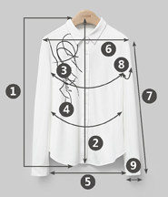 | 尺码 | ①前衣长 | ②后中长 | ③胸围 | ④腰围 | ⑤下摆围 | ⑥肩宽 | ⑦袖长 | ⑧袖臂围 | ⑨袖口围 | ||