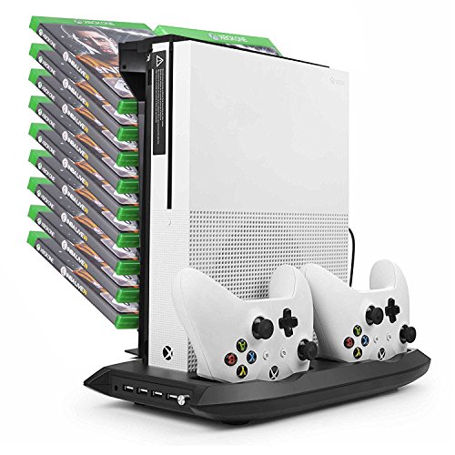 -. Feature : [ALL-IN-1]: (NOT FOR REGULAR XBOX ONE)Stable vertical stand for Xbox one S console, powerful cooler, 18 slots to store games, 4 extra USB ports, a great concept Xbox one S accessory. / [DETACHABLE DESIGN]: The game storage is detachable, it can hung on the top of Xbox one S to make it vertically stand by console, also can be detached to put on any spare place, 18 slots to store your games and other discs, get everything organized and mostly save space. / [SILENT GUARD]: 3000RPM high-speed and quite fan is equipped, prevent your Xbox One S from overheating, prolong console's life, a great protector. / [POWERFUL CHARGING STATION]: Dual charging ports for controllers, one step make your controllers easily charged, and we recommend play and charge kit for your controllers when charging (Controller is not included), charging ports are compatible with Xbox One/ Xbox One Elite/ Xbox One S controller. / [4 EXTRA USB PORTS]: Convenient for powering your other devices.