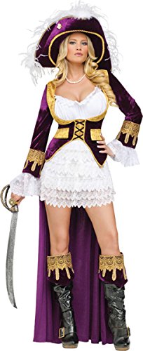 -. Feature : Includes luxurious eggplant velvet coat with gold brocade lapels, white lace tear-drop lace under dress, lace cuffs, and matching tricorner pirate hat with plume / Size small 4-6