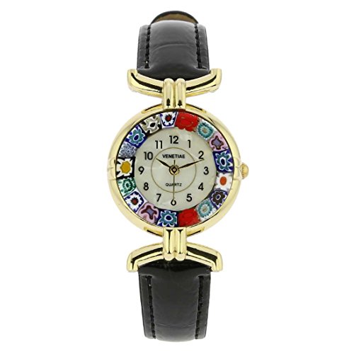 -. Title : Murano Glass Millefiori Watch with Leather Band - Black