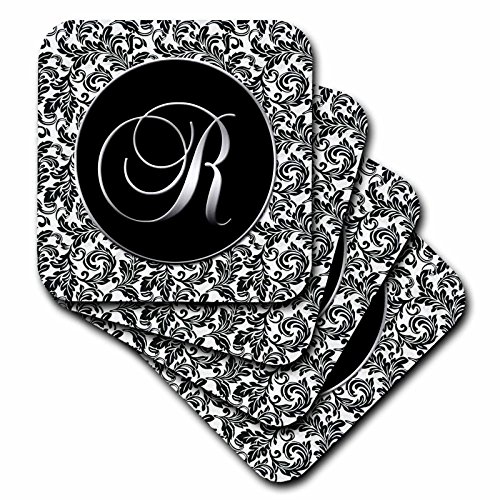 3dRose cst_38767_2 Letter R Soft Coasters, Black and White Damask, Set of 8