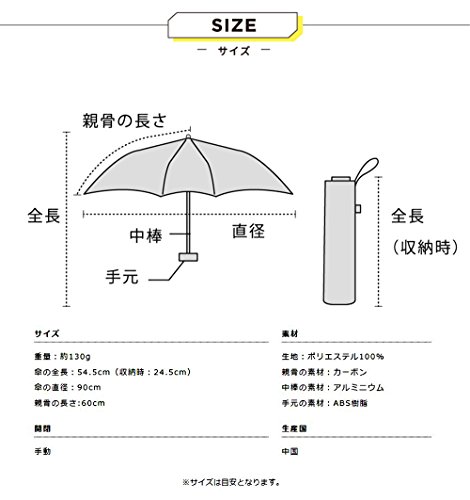 -. Feature : 本体サイズ:(全長)約54.5cm、(傘の直径)約90cm、(親骨の長さ)約60cm、(収納時全長)約24.5cm / 本体重量:約130g / 素材・材質:(本体)ポリエステル100%、(親骨)カーボン、(中棒)アルミニウム、(手元)ABS樹脂 / 原産国:中国 / 開閉:手開き / 紫外線遮蔽率:(濃色)約90%、(淡色)約80%