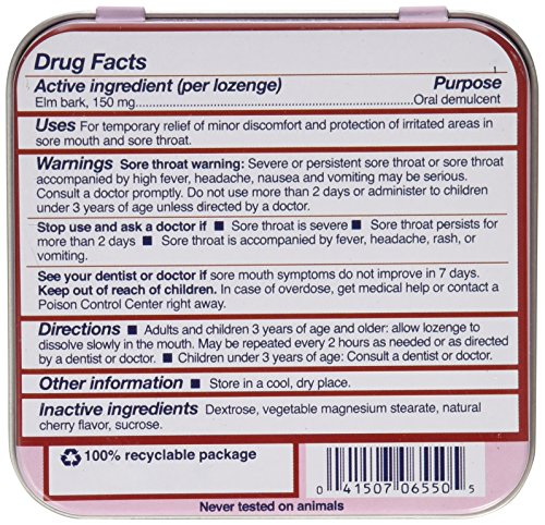 -. Feature : Trusted since 1847 by tenors, teachers, tour guides and other types who trill, talk and testify, Thayer's slippery elm lozenges speed relief to the throat and mouth / Made from the inner bark of the slippery elm tree (ulmus fulva), these dependable dlcents soothe the tissues of the mouth and throat and restore the voice without the dulling effects of menthol / Made in united states / Tin of 42 Thayers Cherry Slippery Elm Lozenges to relieve and sooth sore throat and mouth / Slippery elm soothes mouth and throat tissues to restore the voice without the dulling effects of menthol / Cherry flavor is naturally tangy and sweet / All natural, free of preservatives, gluten, lactose and sodium / Trusted since 1847; Vegan; Not tested on animals