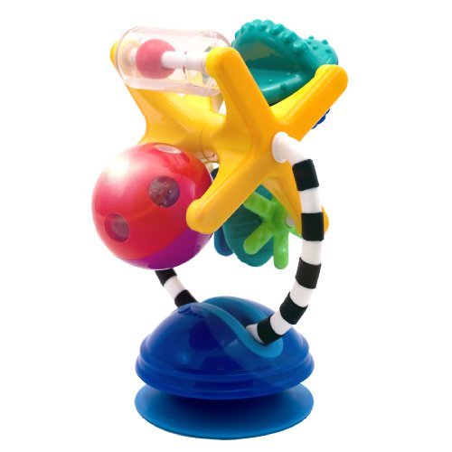 2 toys in 1: Suction base for use on highchair or table surface, removable rotating toy for carry along