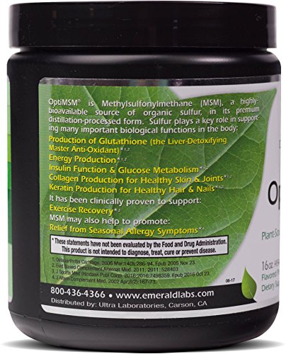 -. Feature : SUPERIOR JOINT HEALTH: MSM is a naturally-derived sulfur formula that helps support joint functionality and comfort, specifically connective tissue health. MSM may also improve flexibility and restores collagen production. / IMMUNE & RESPIRATORY FUNCTION SUPPORT: MSM also provides potential support for healthy immune and respiratory function. MSM may lower inflammatory responses that contribute to swelling and stiffness, which helps support the immune system and facilitates normal cellular activity. / STRENGTHEN YOUR HAIR, SKIN, & NAILS: MSM (natural sulfur) also supports tissue containing significant amounts of collagen and keratin, including hair, skin, and nails. Sulfur is required for the production of these "youthful" compounds. / NATURAL INGREDIENTS: Dietary supplement guaranteed to be FREE of corn, milk, soy, salt, sugar, wheat, yeast, artificial flavors or preservatives. Gluten Free. Additive-Free. No Magnesium Stearate. No Fillers. No Chemicals. / THE EMERALD LABORATORIES MISSION/PROMISE: Emerald Laboratories is committed to creating only clean, additive-free products. You can be 100% certain that our ingredients are offered to you in the purest form possible.