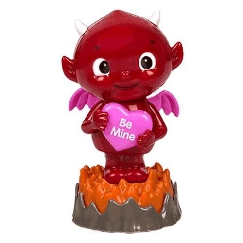 -. Feature : This sweet little red devil figurine stands in a ring of orange flames. He's smiling and holding a pink conversation heart and asking you to "Be Mine"? He's topped with tiny white horns, pink " angel " wings and a small curled tail with a heart tip. Who could say no to this devil in disguise? / Solar powered bobble head dancing Devil figure. Place in a bright or sunny place and watch him dance! / Great decoration for office desk, window sill, or a car dashboard ornament. Unique gift for colleagues, friends and family. Great for a Birthday, Holiday, Valentines Day or any day! / •Individually packed in a see-through clamshell packaging. Eco-friendly. Batteries are not needed. Hassle-free. / needed. Hassle-free. 4 " (H) x 2 " (W)
