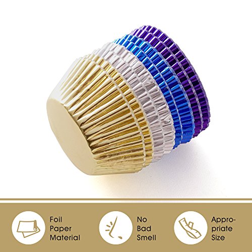 Prodigen Foil Cupcake Liners Baking Muffin Paper Cases Silver & Gold & Purple & Blue 4 Colors Cake Baking Cups for Birthday, Wedding, Party, Festival for Boys, Girls, Kids, Adults(1 Pack)