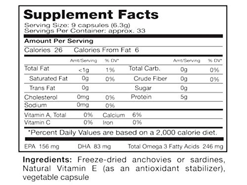 -. Feature : Freeze-dried 75% fish protein content; Made from whole sardines and anchovies captured and processed by Seagate Products / One serving (9 capsules) contains 5 grams of protein, 246mg Omega-3's, 156mg EPA, 83mg DHA and only 26 calories per serving / A very fine powder that is easy to digest and quick to absorb / A perfect source of food for trips, camping or as a temporary meal substitute during emergencies / Receive the full nutritional benefits from eating whole fish while eliminating the cooking, tasting and chewing