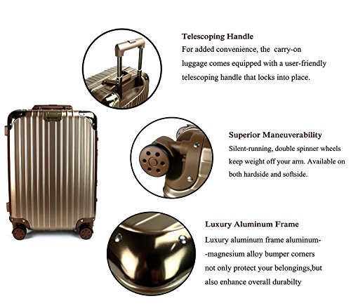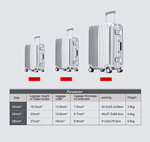 Product Description A great choice for international travel,there are 5 size of this hardside spinner luggage for your choice.The luggage works well for weekend getaways or one- to two-day business trips, offering enough packing space to hold a few changes of clothes, toiletries, and a pair of shoes. 1.Fully Lined Interior with Divider and Zippered Pocket The fully-lined interior has 2 cross-straps to stabilize and organize contents and its own zippered organizational pockets for added packing capacity when needed. 2.Four Wheels Spinners Quiet dual airplane spinner wheels provide effortless movement even on rough pavement. 3.Telescope Handle 3-step telescoping handle allow you to maneuver easily in tight spaces 4.Two TSA Code Lock TSA locks ensure your belongings arrive safely to your destination. Dimensions and weight (no handle): 20 inch :Dimensions in cm (HxWxD): about 20x13.7x9 inches Weight: 4kg/8.8lb 22 inch :Dimensions in cm (HxWxD): about 22x14x9 inches Weight:4.3kg/9.5lb 24 inch :Dimensions in cm (HxWxD): about 24x17x10 inches Weight: 4.6kg/10.1lb 26 inch :Dimensions in cm (HxWxD): about 26x18x10 inches Weight: 5.1kg/11.2lb 28inch :Dimensions in cm (HxWxD): about 28x18x12 inches Weight: 5.4kg/12 lb Instruction: The combination lock of this case will open automatically when you turn The diais to "0-0-0". 0