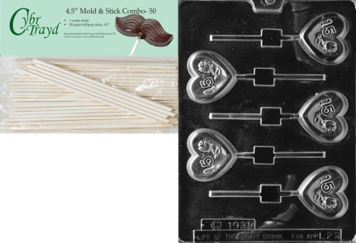 Cybrtrayd 45St50-L022 No.15 Rose Heart Lolly Letters and Numbers Chocolate Candy Mold with 50 Cybrtrayd 4.5-Inch Lollipop Sticks