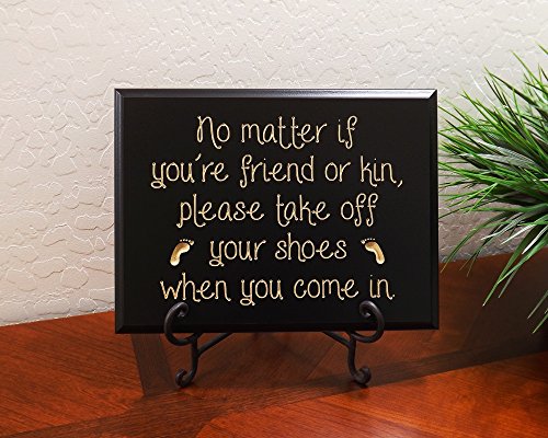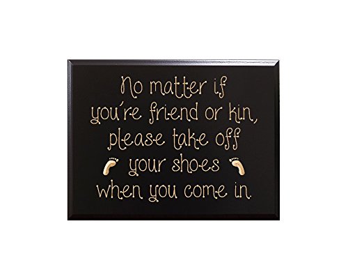 No matter if you're friend or kin, please take off your shoes when you come in. Decorative Carved Wood Sign Quote, Black