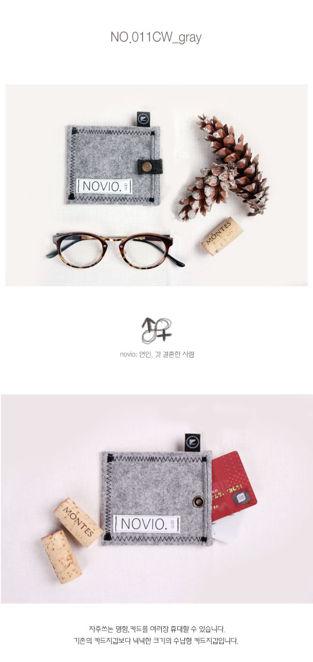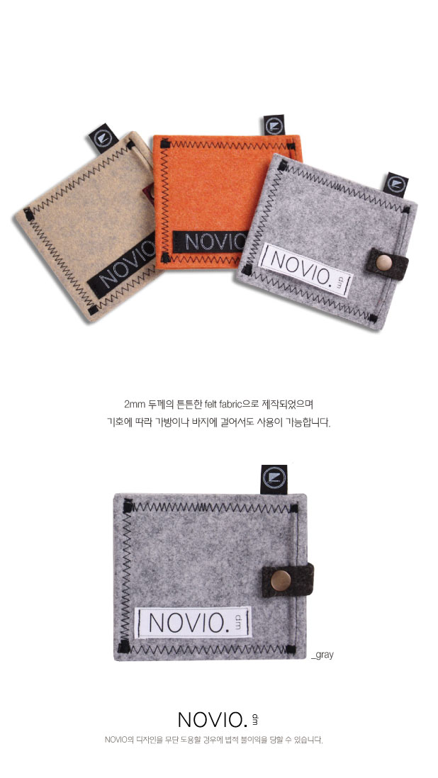 이 제품의 원단은 물방울이 펠트에 떨어졌을 경우 흡수되지 않고 튕겨나가지는 특수발수가공 처리된 2mm 두께의 튼튼한 소재인 FELT FABRIC으로 따뜻한 느낌과 모던하며 유니크한 느낌을 주는 NOVIO 카드지갑 입니다. 기존의 카드지갑보다 넉넉한 크기의 수납형 카드지갑입니다.자주쓰는 카드,명함을 휴대할 수 있으며 고리를 걸어 기호에 따라 가방이나 바지에 걸어서도 사용가능한 심플한 디자인의 카드지갑입니다.