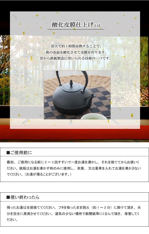 鉄瓶に施されているアラレ文様は、表面積を増やし、熱を逃しにくくする昔からの知恵です。またお湯を沸かすと微量の鉄分が溶出し、不足しがちな鉄分を無理なく摂取できます。 |