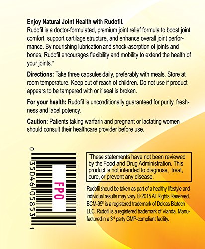 Studio : Vianda Publisher : Vianda Binding : Health and Beauty Product Description Rudofil contains a proprietary blend of ingredients to help support cartilage function, mobility, and flexibility for maximum joint comfort. Glucosamine Sulfate Glucosamine is vital to the body's production of the lubricants and shock-absorbing mechanisms necessary to maintain and restore healthy joint performance. It's found in healthy cartilage and assists in the formation and maintenance of this connective tissue that serves as the spongy material cushioning joints and bones. Glucosamine is most commonly derived from the hard shells of crustaceans like shrimp and lobster; because there are no major food sources of glucosamine, supplementation is an effective way to increase your body's supply. Resveratrol Commonly found in red wine, red grape skins and purple grape juice, trans-resveratrol is a phytonutrient with powerful antioxidant properties, and helps fight free radical damage to joint and muscle tissue. To combat the negative effects stress and other environmental factors can have on joint cartilage, resveratrol works in combination with curcumin to protect cartilage-building chondrocytes. Curcumin (Turmeric Rhizome) Recognizable by its bright yellow color, curcumin, a component of turmeric rhizome, is the main ingredient in mustard and curry and has been used in India for thousands of years as an herbal remedy and a culinary spice. Curcumin acts to combat joint aggravation caused by overexertion by assisting the body's neurological response to stress - the result is noticeable joint comfort. How does Rudofil work? Rudofil contains a powerful combination of glucosamine sulfate, curcumin from turmeric rhizome, and resveratrol, all known for their joint-relieving antioxidant properties. Rudofil helps restore joint comfort by supplying key nutrients for stimulating cartilage function, fighting the free radicals that can lead to joint deterioration. How do I take Rudofil? Take one Rudofil capsule 3 times daily, preferably with meals. 0