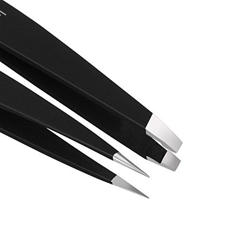The slant pair is for general plucking, and the pointed pair is for a precise hold on thicker individual hairs and for ingrown hairs