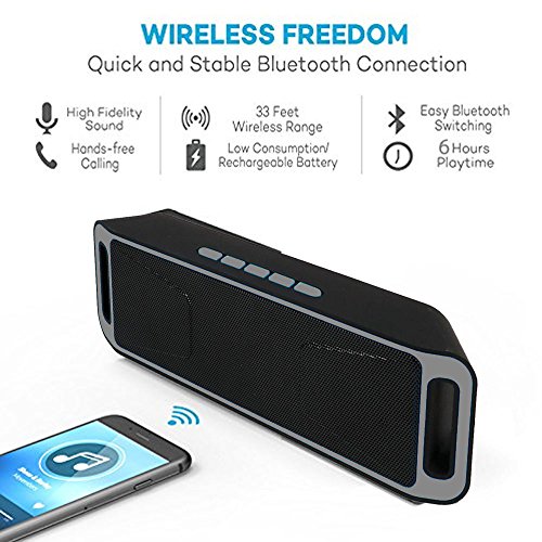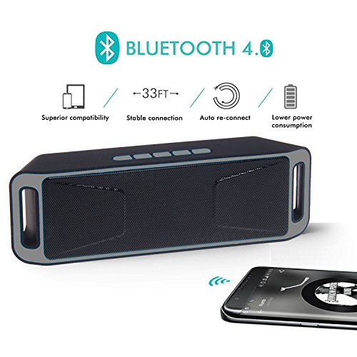 -. Feature : Support All Bluetooth enabled Devices such as iPhone and Android Phones | AUX from computers, laptop and other audio products | Micro SD Memory Card or USB Drive | FM Radio | Phone Call Hands-free Speakerphone / Fashion upscale appearance, the popular sense lines. Two 4 ohm 3W speaker with the full-range speakers, and is equipped with powerful bass diaphragm, independent of the speaker cavity, the perfect interpretation of all kinds of music, suitable for all kinds loving people to buy music, beautiful sound, easy to carry. / Bluetooth wireless transmission, to solve the usual long wire cable short, the trouble! Wireless, like where to put where placed. / You can answer the phone, connect the phone using Bluetooth, speakers with a microphone, you can easily use, zero radiation, the body good. Support FM radio function, use very convenient. Can plug micro SD memory card and USB Driver disk for MP3 player to play music. / Universally Compatible but not limited to all Bluetooth enabled phones or devices such as Apple iPhone 7, iPhone76 plus, iphone 6s, iPhone 6, iPad Air, iPad Mini, Samsung S7, S6, Note 6, Note 5, Galaxy Tab, Google Pixel, Nexus, HTC, Nokia, LG, Motorola, BlackBerry, Sony, Indigi and so on.