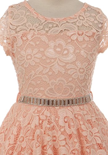 Gorgeous dress that complements the features of your special little girl! Cap Sleeve Lace Flower girls Dresses. Lace Skater Dress with Stone Belt. Zip up back and tie-back sash. Dress is tea length and fabulous! Perfect for flower girl, Junior Bridesmaid, Easter, Pageant, Graduation and other special occasions.Feature