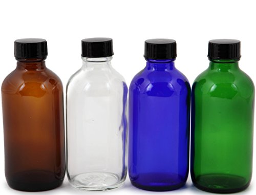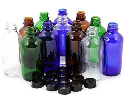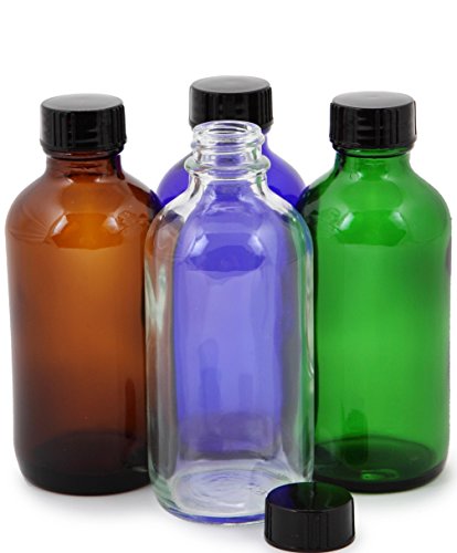 - 12 - 4 oz, Assorted Colors (Clear, Amber, Cobalt Blue) Glass Bottles, with Black Lids.