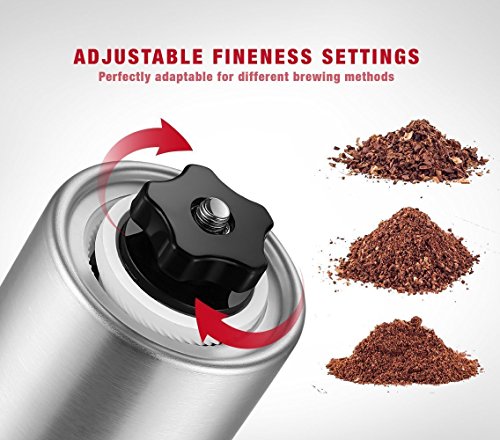 ADJUSTABLE GRINDING THICKNESS: Built-in adjustable grind selector. You can easily achieve a consistent fine or coarse grind by adjusting the inner knob for cafetiere / french press, espresso, aeropress and more!