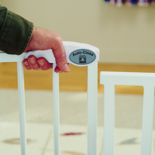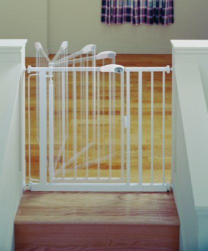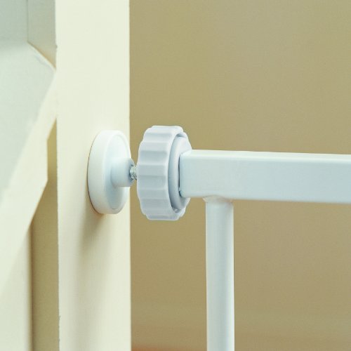 - Feature : Easily adjusts to fit openings 29.5 inches - 38.7 inches with one extension (included) / A maximum of three (optional) extensions 1, 2, 5 and 11-bar extensions can expand gate up to 10 feet 6.75 inches / Ideal for use at top of stairs or between rooms / Pressure mounted and practically requires no hardware or screwing to any wall or doorframe / Metal gate opens fully, then automatically shuts and locks