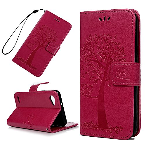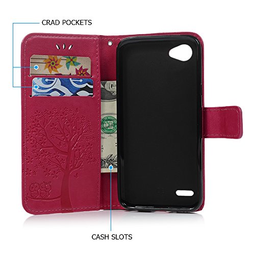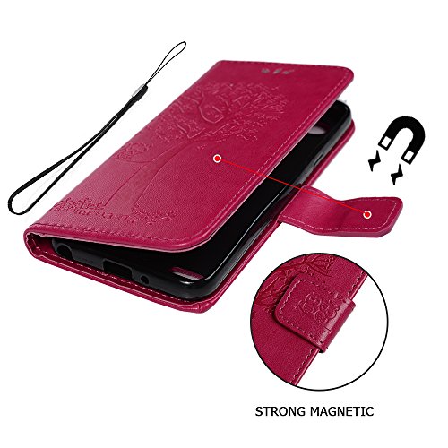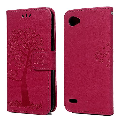 LG Q6 Wallet Case, LG G6 Mini Case, Tree Cute Owl Embossed PU Leather TPU Inner Bumper Card ID Slots Magnetic Closure Hand Strap Stand Flip Protective Cover for LG Q6 / LG Q6 Plus by YOKIRIN, Hot Pink