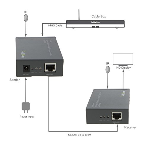 VeLLBox Extend HD AV to 100m Over One Cat5e/6 Cable with POE Support resolution up to 1080p This HDBaseT HDMI Extender extends an HD source with multi-channel digital audio, video and IR to the display Supports POE (Power Over Ethernet) function that makes customer only require one 48V/1A power supply for the sender Built-in IR extender function that means using the remote-controller of the source to control IR from the display side Easily controls the source by IR extender function when the display is away from the source The transmission distance between the source and display can be up to 100m (328ft) over one CAT6 cable The main unit consists of one sender and one receiver, they are small in size 101x101x25 When you need to extend the transmission distance up to 100m (approximate328ft), please better choose CAT 6 cable