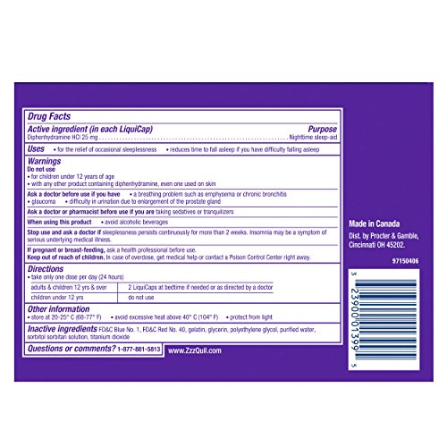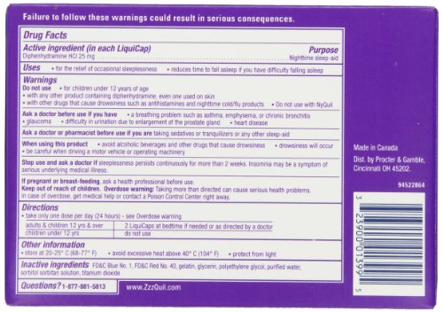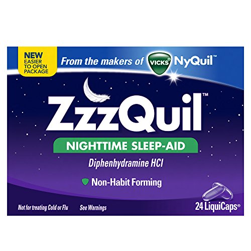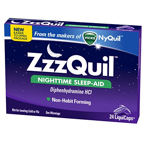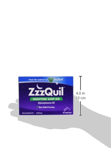 -. Binding : Health and Beauty -. Brand : ZzzQuil -. EAN : 0323900013995 -. Feature : For the relief of occasional sleeplessness, reduces time to fall asleep if you have difficulty falling asleep / Non-Habit Forming / Not for colds, not for pain, just for Sleep, sleep soundly so you wake refreshed / Not for treating cold or flu -. IsAdultProduct : 0 -. Label : Zzzquil -. LegalDisclaimer : 10/2014 dates -. Manufacturer : Zzzquil -. Model : NA -. MPN : NA -. NumberOfItems : 1 -. PackageQuantity : 1 -. PartNumber : NA -. ProductGroup : Health and Beauty -. ProductTypeName : HEALTH_PERSONAL_CARE -. PublicationDate : 2012-04-26 -. Publisher : Zzzquil -. ReleaseDate : 2012-11-08 -. Size : 24 Count -. Studio : Zzzquil -. Title : ZzzQuil Nighttime Sleep Aid Liquicaps 24 Count -. UPC : 323900013995
