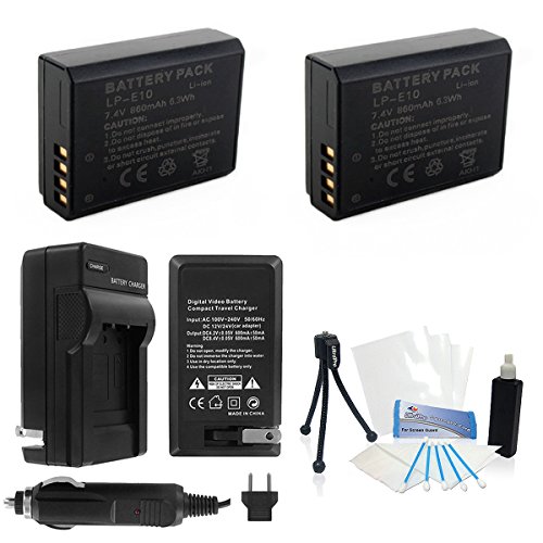 2-Pack LP-E10 High-Capacity Replacement Batteries with Rapid Travel Charger for Select Canon EOS Digital Cameras. UltraPro Bundle Includes: Camera Cleaning Kit, Screen Protector, Mini Travel Tripod