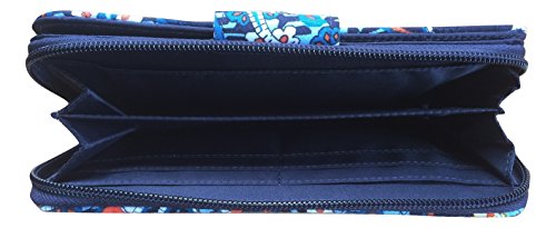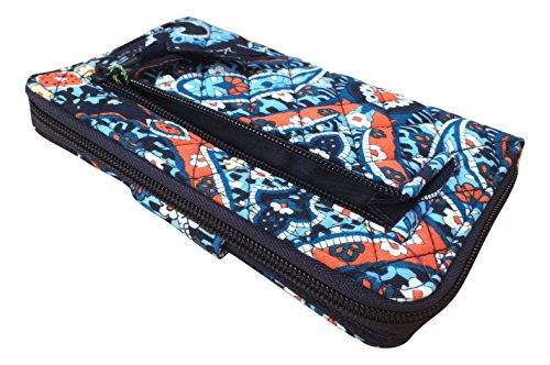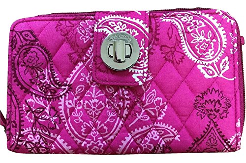Vera Bradley's spacious Turnlock Wallet is made of soft quilted fabric on the outside with a coordinating solid custom print logo fabric on the interiors. There are two main compartments - a zip around portion features 6 card slots and two full length bill compartments. The tab and turn lock closure portion features another 6 card slots, 2 clear ID slots and a full length bill compartment. The back exterior features a zippered pocket. It measures approximately 7 3/4 inches (L) x 4 3/4 inches (H) x 1 inch (W). The location of pattern varies with each wallet. Spot clean with a damp cloth and mild soap. Patterns with solid color interiors are designed and manufactured for Vera Bradley Outlets.Feature