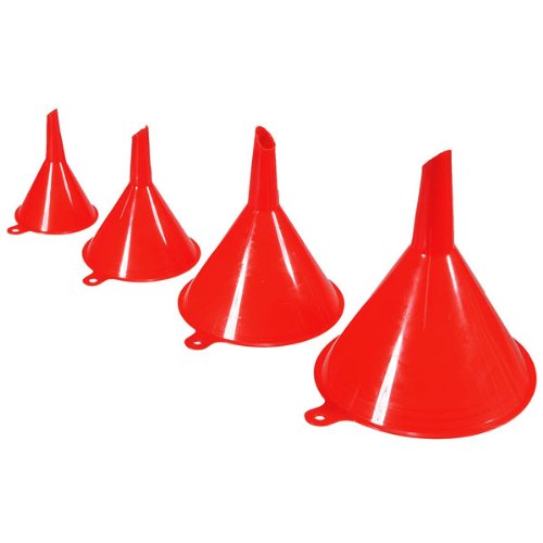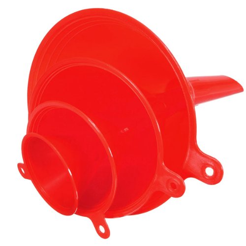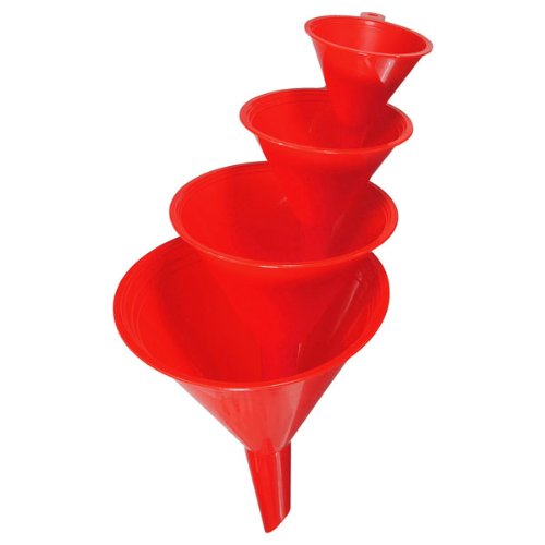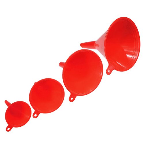 -. Feature : *Material: Plastic *Color: Red / *Total length: 8cm(XS), 9.3cm(S), 12.2cm(M), 14.8cm(L) *Diameter: 5.3cm(XS), 7.2cm(S), 9.5cm(M), 12cm(L) *Quantity: 4pcs / *Durable,lightweight,smooth,easy to handle. / *4 different sizes can meet your needs of usage. *Great to filter liquid,oil, etc. / *Package Included: *1 Set Plastic Funnels