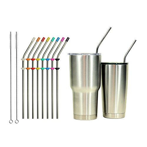 RAINIER Stainless Steel Metal Drinking Straws | Fits Yeti RTIC or Any 20 or 30 oz Tumbler| Extra Long Reusable Ecofriendly | Set of 8 Angled Straws with Silicone Silencers, Comfort Tips, 2 Brushes