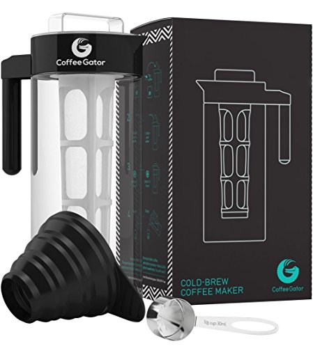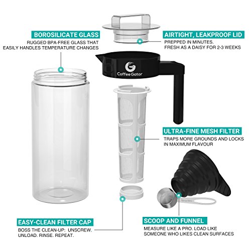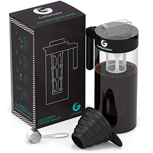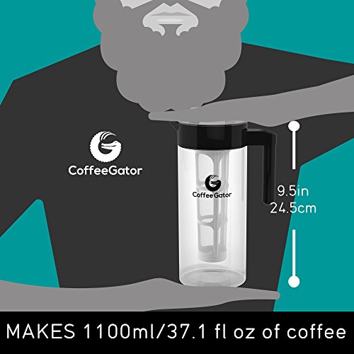 The Coffee Gator Cold-Brewer makes perfect, sweet, refreshing coffee every time. Any experienced cold-brewer knows it's the only way to drink cold coffee. Regular iced-coffee is like a wolf in sheep's clothing: rushed, bitter and dressed up with enough sugar to put you in a diabetic coma. Our cold coffee brewer is here to prevent this kind of medical emergency. It will spread waves of coffee-flavored refreshment throughout your home. Expect a trail of happy, healthy faces following in it's wake. Of course, cold brew does take a little longer. It took Michelangelo four years to paint the ceiling in the Sistine chapel. Do they wish they'd got any old decorator in to do it in a week? It's unlikely. We're not saying your coffee will be as famous as that ceiling, but it'll definitely make the neighbours jealous. In Coffee Gator HQ we love cold brew so much that we've thrown out our old water cooler and banned all other forms of hydration. Each of us now enjoys a happier, more productive life as well as more love from our families (ok, maybe we made that last part up). So dance like there's nobody watching. Love like you'll never be hurt. Sing like there's nobody listening, and make your coffee with a Coffee Gator cold-brewer. Capacity: 37.1 fl oz Height: 9.5" Amazon buyers trust Coffee Gator to supply premium quality coffee accessories. Check out our customer reviews; we're pretty darn proud of them :) 0 |
