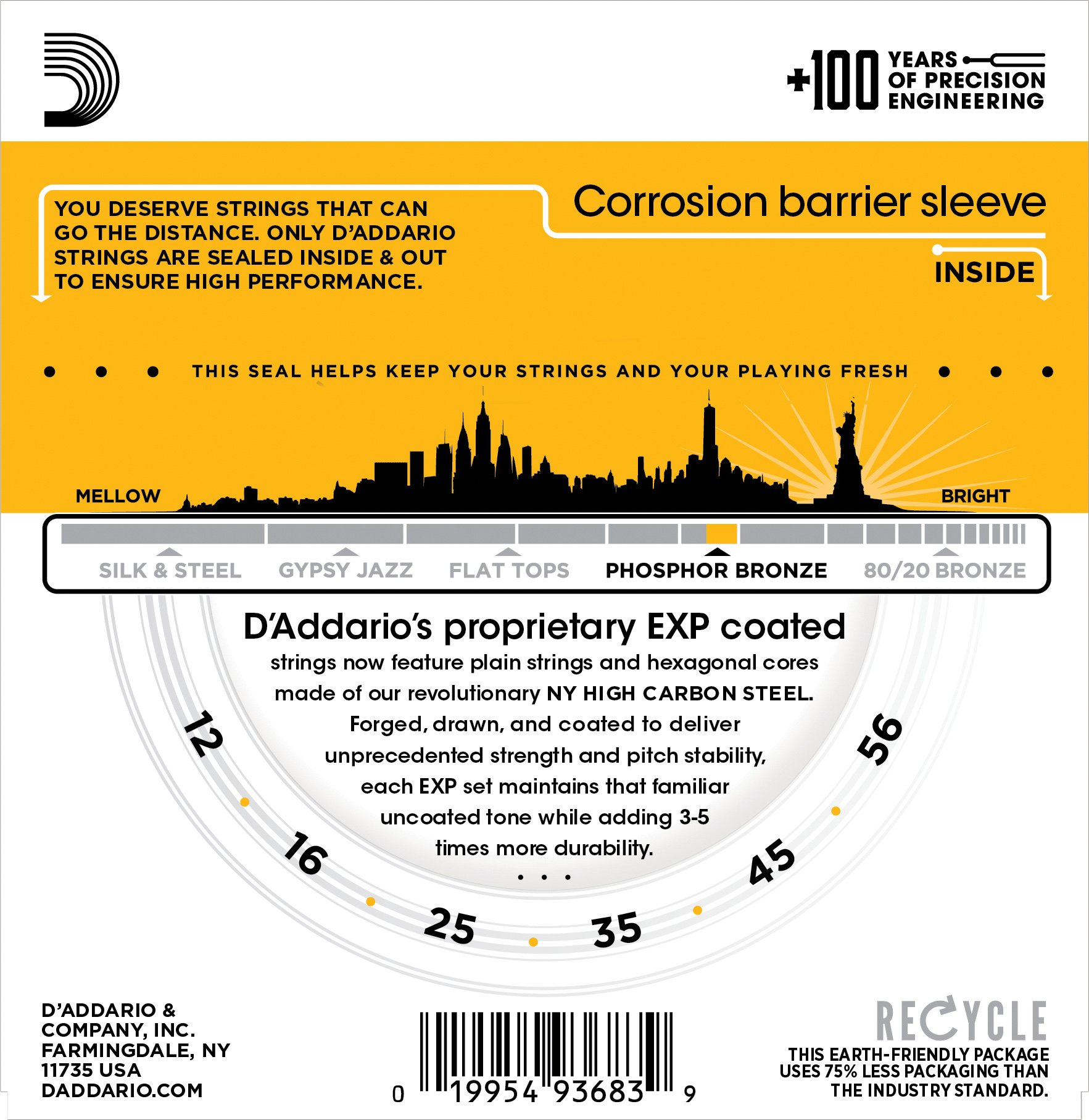 D Addario EXP19 with NY Steel Phosphor Bronze Acoustic Guitar Strings Coated Light Top/Medium Bottom/Bluegrass 12-56