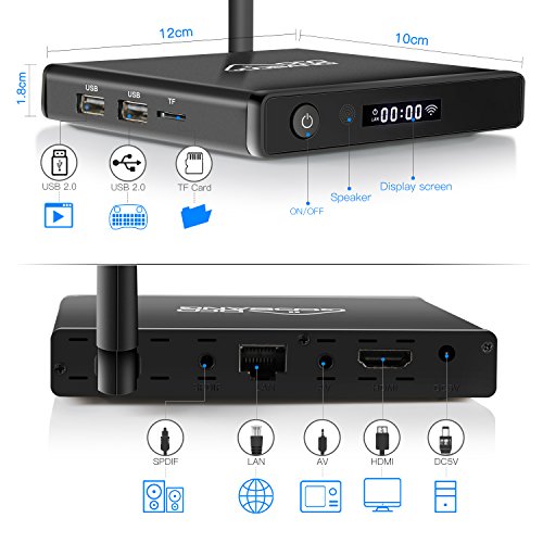 OS: Android: 7.1.2 CPU: Amlogic Quad core Cortex A53 2.0GHz 64bit GPU: Penta-Core Mali-450MP GPU @ 750MHz ROM: 2GB DDR3 RAM: 16GB EMMC FLASH Power Supply: DC 5V 2A Power Indicator (LED): Blue(ON); RED(Standby status) 3D: Hardware 3D graphics acceleration HDD file system FAT16/FAT32/NTFS Support Subtitle: SRT/SMI/SUB/SSA/IDX USB High Definition video output: 4k*2k LAN: Ethernet:10/100M, standard RJ-45 Wireless: Support 802.11 a/b/g/n at 2.4GHz